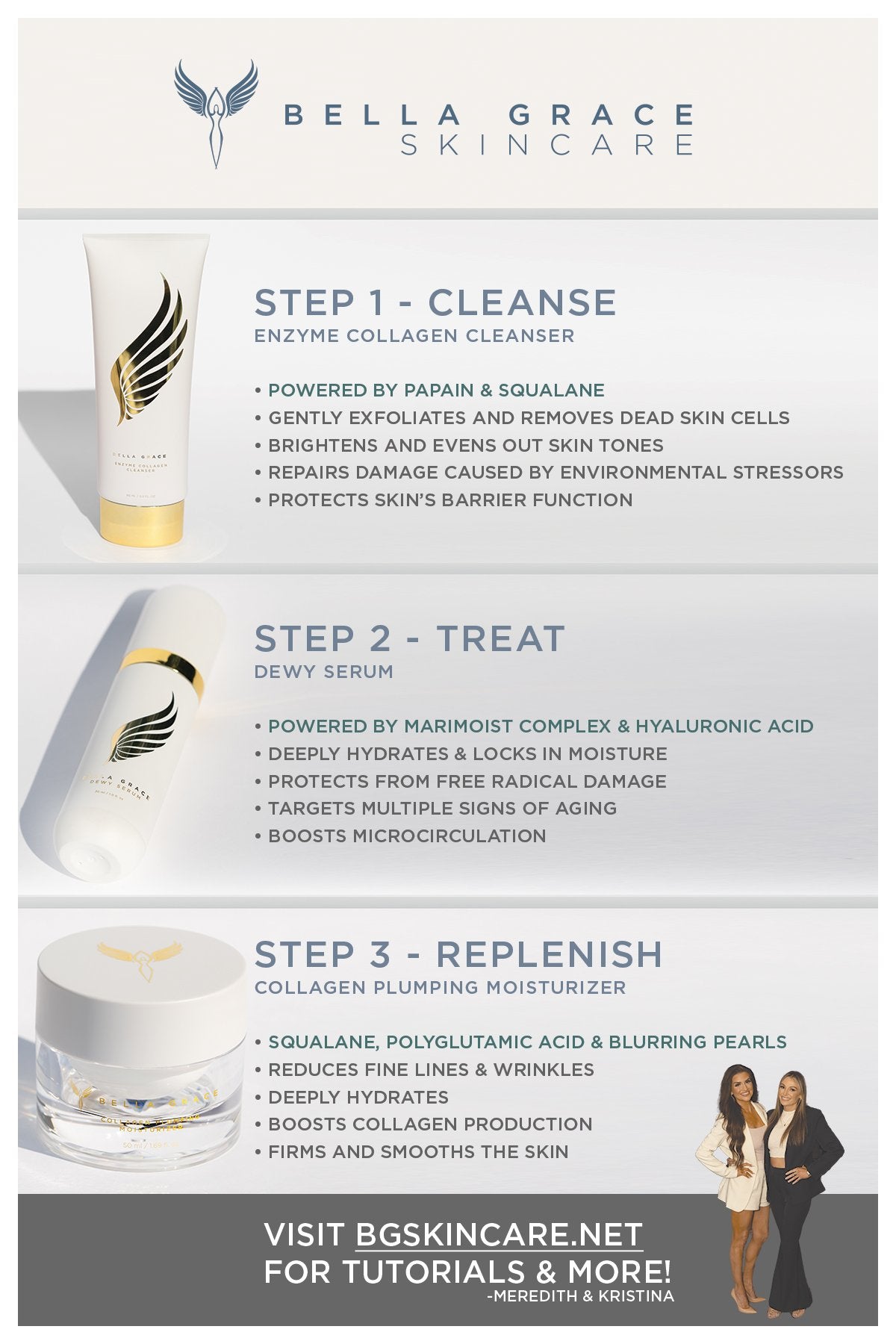 فوري وبسيط هما كلمتان فقط ستستخدمينهما لوصف نظام بيلا غريس كولاجين غلو BG Collagen Glow Regimen. لقد صممنا كل منتج من منتجاتنا ليكون متعدد المهام ويستهدف علامات متعددة للتقدم في السن. عندما تستخدمين كل منتج من المنتجات الثلاثة، ستوفرين الوقت وتلاحظين وتشعرين بالنتائج الفورية. بالإضافة إلى أننا صممنا هذا النظام ليكون مناسبًا لجميع أنواع البشرة.