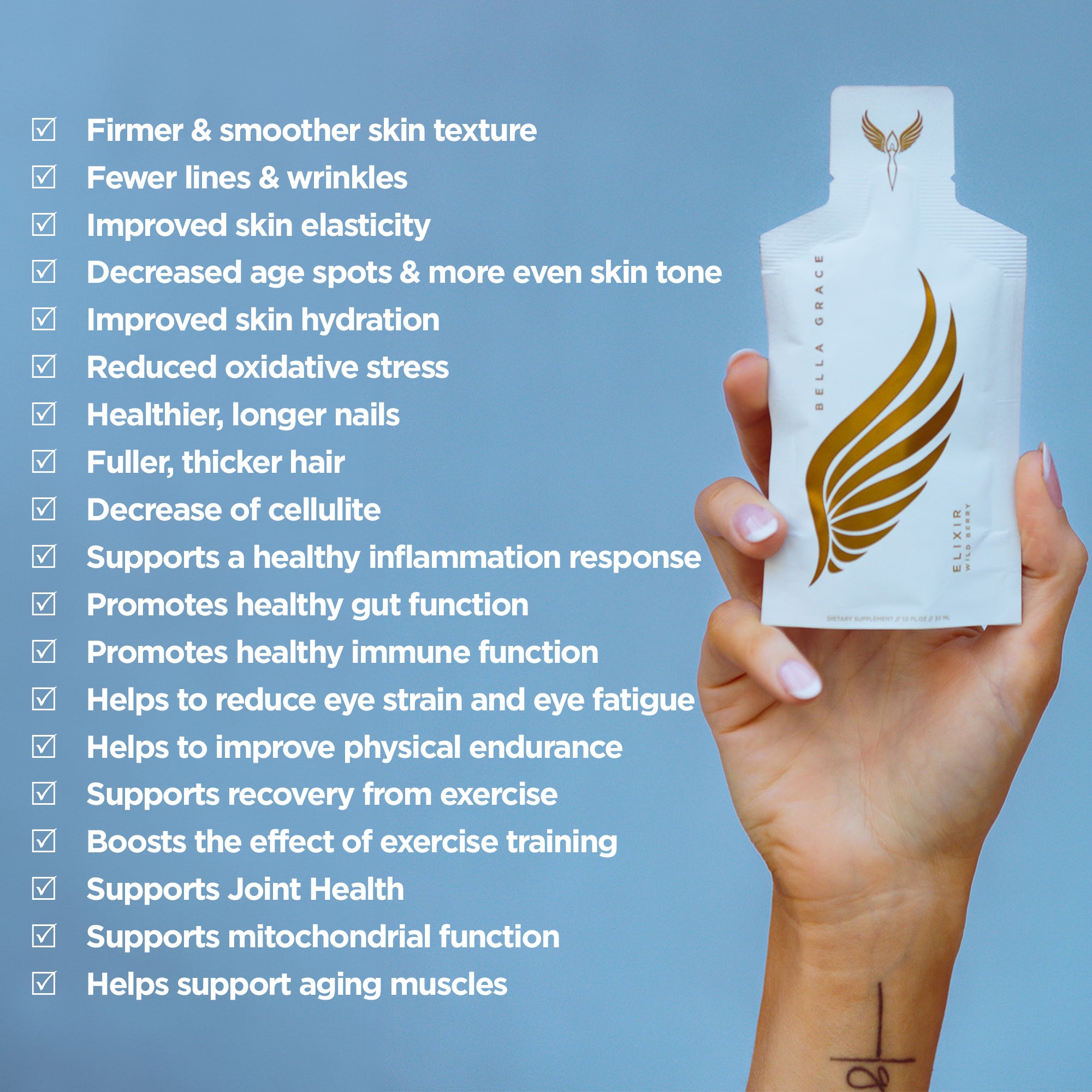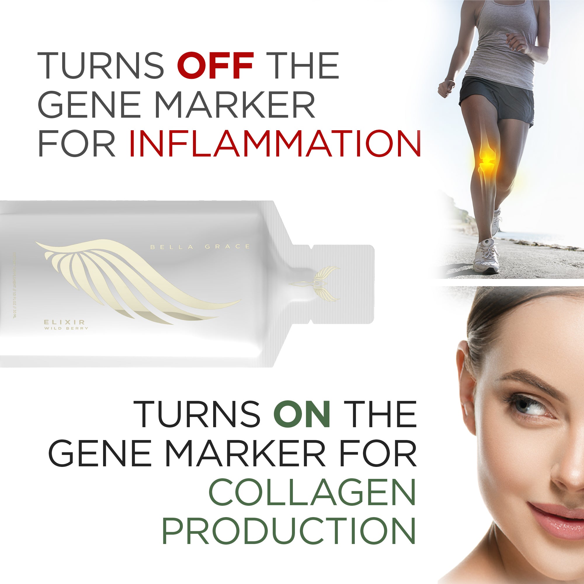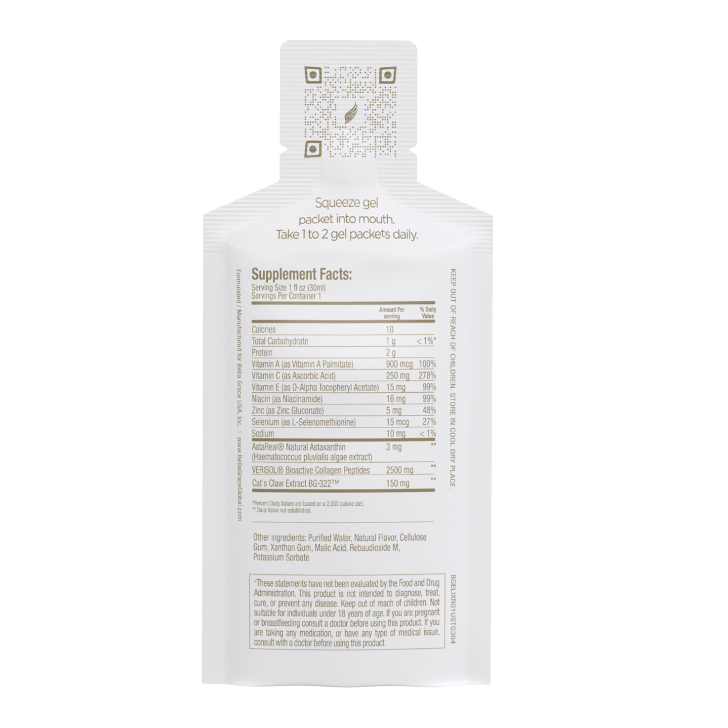 إكسير بيلا جريس، مكمل بيلا جريس المثالي لصحة الجسم بالكامل، يحتوي على ما لا يحتويه أي منتج آخر من الكولاجين: الفيريسول الأكثر إثباتًا سريريًا في العالم® الكولاجين مع أستاريل® أستازانتين ومخلب القط BG-322™. يساعد هذا المزيج الخاص على تنظيم العمليات التي تعيد بناء الكولاجين، بالإضافة إلى توفير تأثيرات مضادة للأكسدة ومضادة للالتهابات. 30 عبوة لكل علبة